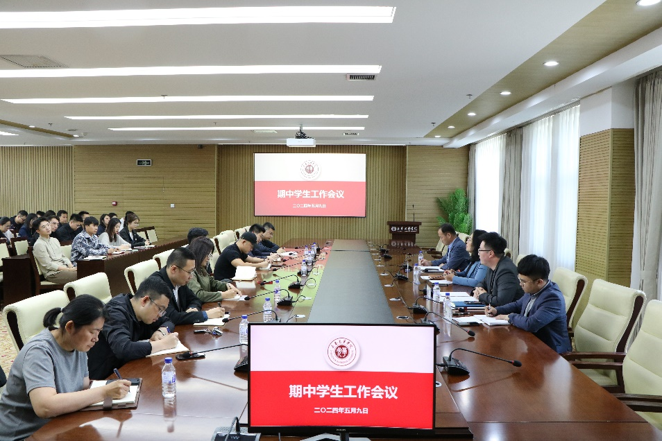 5月9日下午,我校于行政楼第一会议室召开2024年春季学期期中学生工作会议,校党委副书记、副校长高海英出席。学生工作处处长、团委书记杨鸿,校友工作办公室主任李洪雨,学生工作处副处长赵闯,各教学院党总支副书记,学生工作处、校团委全体成员,全体辅导员参会。会议由杨鸿主持。