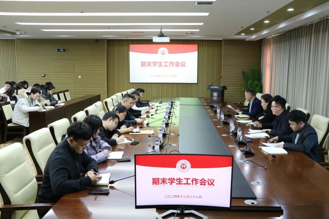 12月23日下午,我校在行政楼二楼会议室召开2024年秋季学期期末学生工作例会,校党委副书记兼副校长高海英出席。学生工作处处长杨鸿,校友工作办公室主任李洪雨,团委副书记、学生工作处副处长赵闯,各学院党总支副书记,全体辅导员及学生工作处、校团委、校友办全体成员参会。会议由杨鸿处长主持。